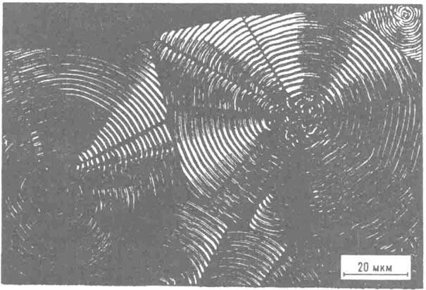 При кристаллизации из расплава кристаллиты агрегируются в разл. надмолeкулярные образования, чаще всего в сферолиты, в к-рых ламели радиально расходятся из общих центров (рис. 2). Наблюдаются сферолиты диаметром от неск. мкм до неск. см. Предполагается, что в кристаллитах блочных образцов часть макромолекулы имеет складчатую конформацию, а др. часть проходит из кристаллита в кристаллит, связывая их друг с другом. Эти "проходные" цепи и области складывания образуют аморфную часть сферолитов.