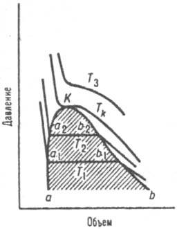Рис. 1. Диаграмма равновесия жидкость пар для чистого вещества. Т1. Т2, Tк, Т3 - изотермы, К грипп, точка, аКb - пограничная кривая; заштрихована область двухфазного равновесия.