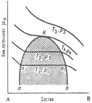 Рис. 2. Зависимость хим. потенциала mА компонента А двойной системы А-В от состава. T1p1, T2p2, Tкpк, T3p3 - изотермы-изобары, К - критич. точка, аКb - пограничная кривая; заштрихована область двухфазного равновесия, в к-рой хим. потенциал не зависит от состава.