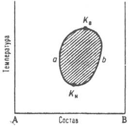 Рис. 4. Диаграмма равновесия жидкость - жидкость для двойной системы А - В. КB и KA верхняя и нижняя критич. точки смешения (р-римости) соотв., аКBbКA - пограничная кривая; заштрихована область двухфазного равновесия.