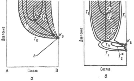 Рис. 5. Диаграмма равновесия газ газ для двойной системы А В. KB, критич точка менее летучего компонента В; заштрихована область двухфазного равновесия газ-газ. а - равновесие газ-газ первого типа; TB Т1. Т2 - изотермы равновесия газ газ. КBK1K2 критич. кривая равновесия газ газ, bКB - участок критич. кривой равновесия жидкость - газ; 6 равновесие второго типа: T1, ТD, Т* - изотермы равновесия жидкость газ. TD, Тn2 - изотермы равновесия газ - газ. DK2 - участок критич. кривая равновесия газ-газ, D - двойная критич. точка.