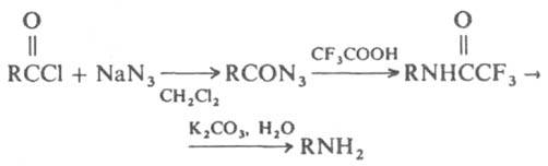 Если радикал хирален, он мигрирует к атому N с сохранением конфигурации. Одна из модификаций Курциуса реакции-синтез ацилазидов в р-ре СН2Сl2 с послед. действием на ацилазид небольшого избытка CF3COOH: