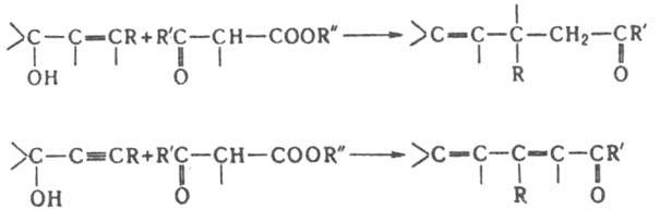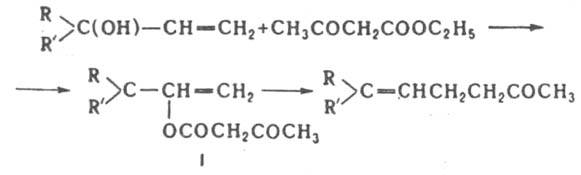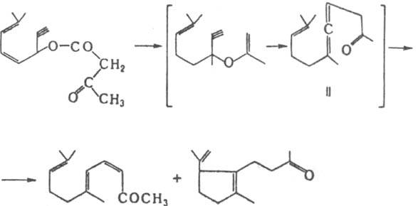 В случае ацетоацетатов ацетиленовых спиртов перегруппировка приводит к образованию алленового кетона (ф-ла II), превращающегося в смесь кетонов, напр.: