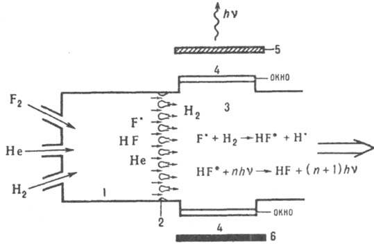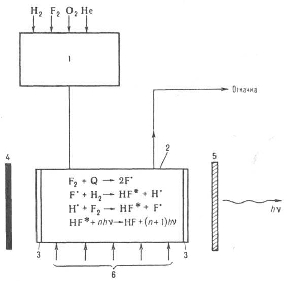 Из смесителя 1 (рис. 1) рабочая смесь поступает в реактор 2, где под действием УФ облучения или пучка электронов (инициирующий агент) инициируется быстрая молекулярно-радикальная р-ция, высвобождающая запасенную в смеси энергию в виде короткого импульса когерентного излучения. При одной и той же степени инициирования чем больше хемолазерная длина цепи р-ции, тем выше энергия лазерного импульса. наиб. употребительны смеси, содержащие молекулярные фтор и водород (дейтерий), стабилизированные кислородом. Эти смеси обладают наиб. хемолазерной цепью. Генерирующими молекулами в них являются колебательно возбужденные HF* (DF*). На рис. 2 представлена схема лазера химического с чисто химическим способом инициирования, работающего на основе нецепной р-ции атомарного фтора с молекулярным водородом (или дейтерием).
