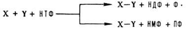 В р-ции X и Y - субстраты, НДФ и НМФ - соотв. нуклеозиддифосфат и нуклеозидмонофосфат, Ф и ПФ - соотв. фосфорная и пирофосфорная к-ты. Для лигаз , у к-рых в сопряженной р-ции АТФ гидролизуется до аденозинмонофосфата (АМФ) и пирофосфата, предложен механизм, согласно к-рому в качестве интермедиата образуется ацил-АМФ; в этом случае АТФ реагирует непосредственно с субстратом X или Y. Нек-рые лигазы (напр., L-глутамилцистеинсинтетаза) функционируют по механизму трехстадийного переноса, для к-рого характерно образование ковалентного промежут. производного фермента: