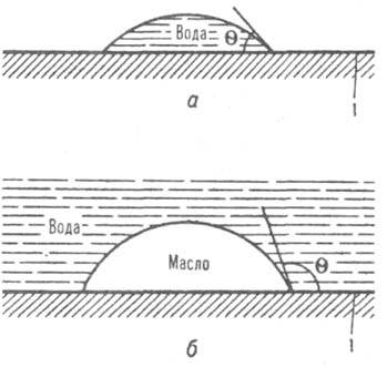 Смачивание водой гидрофильной - пов-ти (а) и избирательное смачивание oлeoфильной (гидрофобной) пов-ти (б); 1 - пов-сть твердого тела.