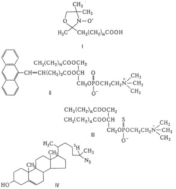 ЛИПИДНЫЕ ЗОНДЫ, липиды, несущие "репортерные" группы (метки) - спиновые, флуоресцентные и др., - поведение к-рых в изучаемой системе можно регистрировать к.-л. методом (обычно спектральным). Осн. требования к меткам в липидных зондах - чувствительность к микроокружению, возможность надежного наблюдения за ее поведением, внесение меткой в наблюдаемую систему миним. возмущений. наиб. часто применяют спиновые, флуоресцентные и фотореактивные метки, а также метки для спектроскопии ЯМР. Липиды, меченные радиоактивными атомами, к липидным зондам обычно не относят. Спиновые (свободнорадикальные) липидные зонды содержат группировку с неспаренным электроном (применяются исключительно нитроксильные радикалы; см., напр., соед. ф-лы I). Параметры спектра ЭПР несут информацию о подвижности и ориентации окружающих липидные зонды молекул и их частей, об окружающих электрич. и магн. полях (см. также Спинового зонда метод).