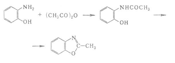 Аминофенолы легко образуют N-ацилзамещенные при обработке, напр., ангидридами кислот. о-Аминофенол, склонный к замыканию цикла, при ацилировании в жестких условиях превращается в замещенные бензоксазола, напр.: