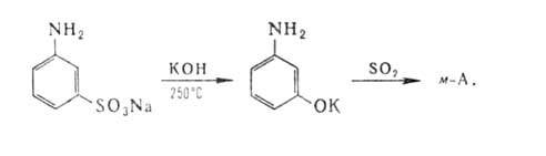 В промышленности м-аминофенол получают из натриевой соли метаниловой кислоты: