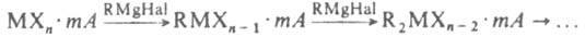 (А - р-ритель). Это осн. метод синтеза металлоорг. соед. переходных и непереходных металлов с s-связью металл-элемент. Р-ции способствуют более полярные р-рители. В обычных условиях RMgHal не присоединяются к несопряженным алкенам и алкинам. При высоких т-ре и давлении RMgHal присоединяются к терминальным алкенам, сопряженным алкенам и алкинам, что используют как стадию в орг. синтезе. О наиб. важных р-циях RMgHal с соед., содержащими связи С=О,