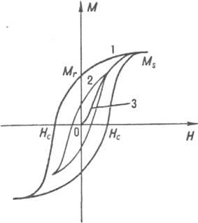 Кривые намагничивания и размагничивания ферромагнетика: Н - напряженность внеш. магн. поля; М -намагниченность образца; Нc - коэрцитивная сила; Мr - остаточная намагниченность; Мs - намагниченность насыщения; 1 - предельная петля гистерезиса; 2 - непредельная (частная) петля; 3 - начальная кривая намагничивания.