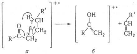 Мак-Лафферти перегруппировка впервые обнаружена Ф. Мак-Лафферти в 1956 при изучении алифатич. кетонов и карбоновых к-т (X = О). Характерна также для алкенов, альдегидов, сложных эфиров, амидов, тиокетонов, тиоэфиров, оксимов, гидразонов, азометинов, нитрилов и др. Перегруппировка региоселективна. Легкость протекания р-ции определяется расстоянием между группой СХ и атомом Н в g-положении, к-рое не должно превышать 0,18 нм. Протекание перегруппировки в каждом случае доказывается изучением дейтеромеченых соед., наличием в масс-спектре метастабильного пика, отвечающего переходу а в б, а также исследованием распада катион-радикала а методом тандемной масс-спектрометрии. Мак-Лафферти перегруппировка используется для определения строения орг. соединений.