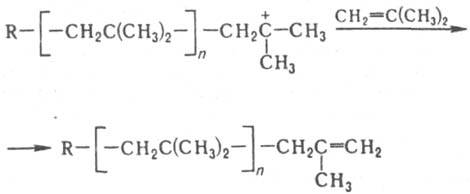 2) ионной или радикальной полимеризацией с интенсивной передачей цепи на мономер, как, напр., в случае изобутилена: