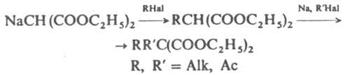При взаимод. натриймалонового эфира с дигалогенидами в зависимости от соотношения реагентов (2:1 или 1:1) образуются эфиры высших тетракарбоновых или циклоалкандикарбоновых к-т: