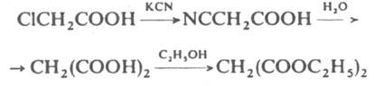 В пром-сти малоновый эфир получают из монохлоруксусной к-ты: