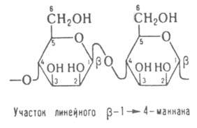 МАННАНЫ, прир. полисахариды, в составе к-рых остаток D-маннозы является единственным или преобладающим моносахаридом. Встречаются в высших и низших растениях и грибах, характеризуются большим разнообразием структур, физ.-хим. св-в и биол. ф-ций. Линейные b-1 : 4-маннаны (см. ф-лу), подобно целлюлозе, не раств. в воде и в качестве структурных полисахаридов входят в состав клеточных стенок нек-рых высших растений и водорослей; они также участвуют в построении защитных оболочек плодов и семян, напр. скорлупы орехов. Химически близкие линейные глюкоманнаны (содержат наряду с маннозой остатки глюкозы) с тем же типом связей между моносахаридными остатками, часто содержащие ацетильные группы, относятся благодаря р-римости в воде к растит. слизям и запасаются в качестве резервного материала рядом однодольных растений (напр., в луковицах лилиецветных и клубнях орхидных).