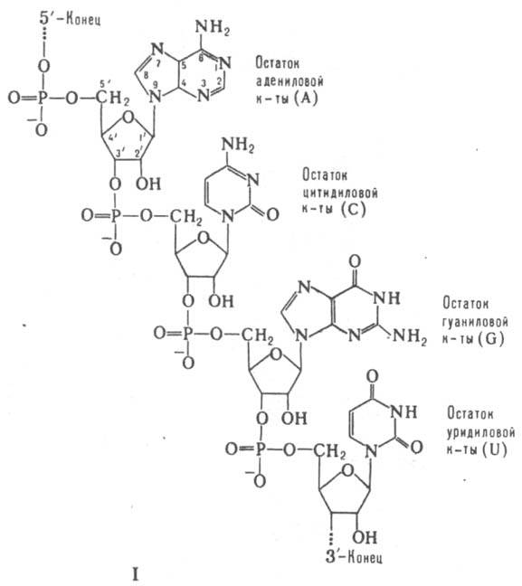 МАТРИЧНЫЕ РИБОНУКЛЕИНОВЫЕ КИСЛОТЫ (информационные РНК, мРНК, иРНК), молекулы РНК, представляющие собой комплементарные (см. Комплементарность) копии участков значащих цепей генов (ДНК), в к-рых закодирована информация об аминокислотных последовательностях полипептидных цепей белков. Образуются в результате транскрипции (синтез РНК на ДНК-матрице с помощью фермента ДНК-зависимой РНК-полимеразы) и послед. процессинга первичного транскрипта - удаления избыточных РНК-последовательностей с обоих концов молекулы и некодирующих последовательностей РНК, а также сшивания кодирующих участков РНК друг с другом. мРНК переносят генетич. информацию от генов к рибосомам, где происходит трансляция (синтез полипептидных цепей на мРНК-матрице). При этом одну цепь мРНК могут одновременно транслировать неск. рибосом (т. наз. полирибосомы, или полисомы). мРНК всегда состоят из одной полинуклеотидной цепи, т. е. относятся к однотяжевым РНК. Как и любые др. РНК, мРНК включают остатки адениловой (А), гуаниловой (G), уридиловой (U) и цитидиловой (С) к-т, связанных между собой 3'-5'-фосфодиэфирными связями (ф-ла I). Вторичная структура мРНК представлена многочисл. двухспиральными участками ("шпильками"), образующимися в результате комплементарного спаривания оснований (А с U и G с С) одной и той же цепи; шпильки соединены между собой короткими однотяжевыми участками. При связывании с рибосомой макромолекулярная структура мРНК существенно изменяется, а двухспиральные ее участки в районе непосредств. контакта с рибосомой переходят в однотяжевое состояние.