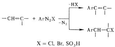 Винилхлорид, винилиденхлорид, акрилонитрил, стирол легко образуют хлорарилпроизводные, к-рые количественно дегидрохлорируются основаниями, превращаясь в арил-производные, напр.: