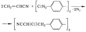 бис-Диазосоединения реагируют с двумя молекулами ненасыщ. соед., напр.: