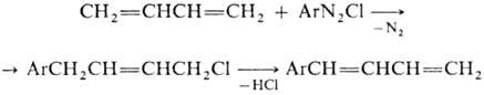 Сопряженные диены (дивинил, изопрен, хлоропрен и др.) хлорарилируются в положения 1 и 4. Образующиеся при этом 1-хлор-4-арил-2-бутены при дехлорировании основаниями с хорошим выходом превращ. в 1-арил-2,3-бута-диены, напр.: