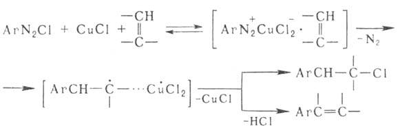 Механизм Меервейна реакции включает свободнорадикальное присоединение к кратной связи Аr . и X., возникающих при гомолитич. распаде тройного комплекса, к-рое инициируется, как предполагают, в результате происходящего в нем окислит.-восстановит. процесса, напр.: