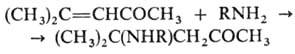 Мезитила окись присоединяет по двойной связи галогены, HCN, НСlО, амины, воду и др., напр.: