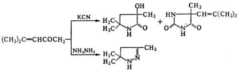 Идентифицируют мезитила окись по ее производным: 2,4-динитро-фенилгидразон имеет т.пл. 205-206°С; оксим существует в двух формах-лабильная а-форма, т. кип. 84°С/11 мм, устойчивая р-форма, т. пл. 49 °С, т. кип. 92 °С/9 мм; семи-карбазон имеет также две формы: а, т.пл. 164°С, и (3, т.пл. 133-134°С; а-форма переходит в р при нагр. гидрохлорида, а b-форма-в a при действии щелочи.