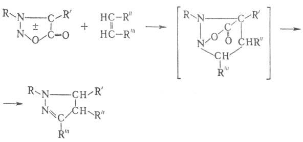 Под действием сильных к-т и оснований, при электрохим. восстановлении, каталитич. гидрировании, окислении, термолизе, облучении УФ светом происходит раскрытие цикла. Так, нагревание сиднонов со щелочами приводит к разрыву связи О—С цикла и образованию N-нитрозоглицинов, с к-тами-к образованию производных гидразина. Этот метод имеет препаративное значение для получения малодоступных алкилгидразинов. Кислотным расщеплением 3-фенил-изопропилсиднона получен гидрохлорид 3-фенилизопро-пилгидразина, обладающий антидепрессивными св-вами. С алкенами и алкинами сидноны и сиднонимины вступают в р-цию циклоприсоединения с послед. образованием пира-золов или пиразолинов, напр.: