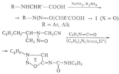 Мезоионные соединения-термически устойчивые кристаллические соединения с т.пл. обычно > 100°С. Наиболее изучены сидноны и их азотистые аналоги-сиднонимины (ф-ла I; X = NR:).