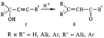 В Мейера - Шустера перегруппировку вступают спирты, содержащие ОН-группу в a-положении к тройной связи (в т. ч. спирты с неск. кратными связями) и ацетиленовые диолы. В качестве катализаторов обычно применяют неорг. и орг. к-ты (напр., H2SO4, НСl, НСООН, ССl3СООН, n-СН3С6Н4SО3Н), ацетилхло-рид, ацетангидрид, тионилхлорид, фенол и др. Лучшие выходы получаются при использовании в качестве р-рителей диоксана, ацетона, спиртов, сложных эфиров.