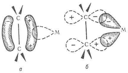 Распределение электронной плотности между атомом металла и лигандом зависит от природы металла, степени его окисления и от строения орг. лиганда. При этом изменения результирующих зарядов на атоме металла и лиганде при образовании p-связи невелики, что обусловлено особенностями связей металл -лиганд. Эти связи состоят из двух компонент: донорно-акцепторной и дативной. Первая обусловлена подачей p-электронов лиганда на мол. орбитали комплекса, образованные с участием d-орбиталей металла. Вторая включает обратную подачу d-электронов металла на мол. орбитали, образованные за счет перекрывания разрыхляющих (несвязывающих) p*-орбиталей лиганда и d-орбиталей металла (см. рис.).