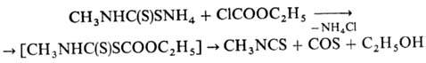 МЕТИЛИЗОТИОЦИАНАТ (метилгорчичное масло) CH3N=C=S, мол.м. 73,12; бесцв. кристаллы; т.пл. 36 °С, т.кип. 119°С; d437 1,0691; nD20 1,5258; давление пара ~2,7 кПа при 20 °С. Р-римость в воде 7,5 г/л (20 °С); хорошо раств. в бензоле, ацетоне, диэтиловом эфире. Метилизотиоцианат легко реагирует с нуклеоф. реагентами. При взаимод. со спиртами и фенолами образуются соответствующие тиокарбаматы; с NH3, аминами, NH2OH-производные тиомочевины, с гидразином-N-метилтиосемикарбазид; с соед., содержащими активные метиленовые группы,-амиды тиокарбоновых кислот. Метилизотиоцианат легко вступает в р-ции циклоприсоединения по связи C=S или N=C. Метилизотиоцианат получают взаимод. метилдитиокарбамата Na или аммония с этиловым эфиром хлоругольной к-ты: