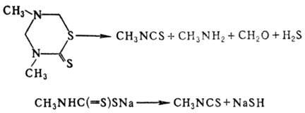 Метилизотиоцианат-фумигант для обработки почвы с целью борьбы с нематодами, сорняками и грибковыми заболеваниями растений. Для борьбы с нематодами используют 17,5% р-р в углеводородном р-рителе ("трапекс") при норме расхода р-ра 17,5-25 г/м2. Метилизотиоцианат-действующее начало таких фумигантов, как "дазомет" и "метамнатрий", к-рые в почве разлагаются соотв. по схемам: