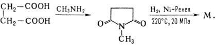 3) Взаимод. янтарной к-ты с CH3NH2 с послед. каталитич. (Ni-Ренея, Со, Pd, Re) или электрохим. восстановлением, напр.: