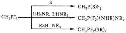 Образует комплексы с основаниями (напр., с аминами) и к-тами Льюиса. Метилтетрафторфосфоран-один из наиб. реакционноспособных фтор- фосфоранов. Реагирует со мн. в-вами, образуя гл. обр. производные метилфосфоновой к-ты или др. фосфораны, напр.:
