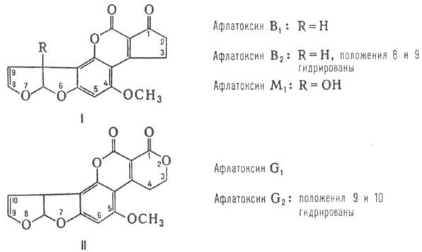 Известно более 250 видов грибов, продуцирующих неск. сотен микотоксинов. Многие из них обладают мутагенными (в т.ч. канцерогенными) св-вами. Среди микотоксинов, представляющих опасность для здоровья человека и животных, наиб. распространены афлатоксины (ф-ла I и II), трихотеценовые микотоксины, или трихотецены (III-V), патулин (VI), охратоксины (VII), зеа-раленон и зеараленол (VIII). Большинство микотоксинов-кристаллич. в-ва (см. табл.), термически стабильны, хорошо раств. в орг. р-рителях. Микотоксины (за исключением охратоксинов) достаточно устойчивы к действию к-т, разрушаются щелочами с образованием нетоксичных или малотоксичных соединений. Биосинтез микотоксинов включает обычно стадию конденсации 1 молекулы ацетил-кофермента А с тремя и более молекулами малонил-кофермента А.