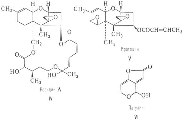П а т у л и н. Впервые выделен в 1943 как антибиотик. Продуцируется грибом Penicillium expansum; ЛД50 17-36 мг/кг (мыши, перорально). Обладает высокими мутагенными св-вами. Ингибирует синтез белка, ДНК, РНК, ферменты, содержащие в активном центре группы SH.