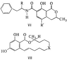 З е а р а л е н о н и е г о п р о и з в о д н ы е (к этой группе относят 15 микотоксинов). Продуцируются грибом Fusarium graminearum.