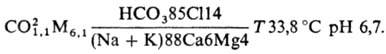 Физ. св-ва и хим. состав минеральных вод изображают в виде ф-лы, в начале к-рой приводится содержание газа (СО2, H2S и др.) и специфич. биологически активных компонентов (Br, I, Fe, As и др.) в г/л, радиоактивность в нанокюри/л (1 кюри = = 3,7.1010 распадов в секунду) и общая минерализация (М) в г/л. Преобладающие ионы записывают в виде условной дроби, в числителе к-рой перечислены анионы, в знаменателе-катионы (%). В конце ф-лы указывается т-ра воды на выходе из источника (°С) и величина рН. Напр., для минеральной воды боржоми ф-ла записывается след. образом: