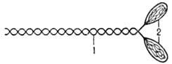 Рис. 1. Схема молекулы миозина: 1-фибриллярный стержень; 2-головки.