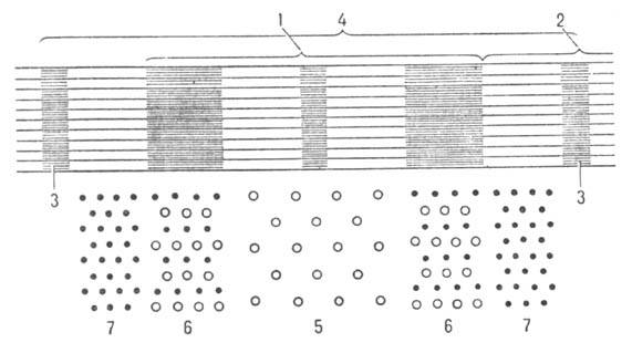 Рис. 2. Схема продольного разреза участка миофибриллы (1 -диск А, 2-диск I, 3-пластинка Z, 4-саркомер); внизу показана схема поперечного среза миофибриллы (5-только нити миозина, 6-нити актина и миозина, 7-только нити актина).