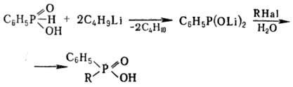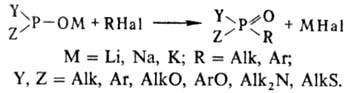 Реакц. способность AlkHal уменьшается от первичных к вторичным и далее к третичным, а также с увеличением мол. массы алкильного радикала. Из трет-AlkHal лишь Аr3ССl дают нормальные продукты Михаэлиса - Беккера реакции, при использовании Аr3СВr обычно образуются Аr3С.. Подобно AlkHal реагируют AcHal, однако в этом случае образующиеся на первом этапе синтеза a-кетофосфонаты могут присоединять исходную соль. При использовании солей тиогидрофосфо-рильных соед. получают тиофосфорильные соединения. В Михаэлиса - Беккера реакции могут участвовать и соли кислых гидрофосфорильных соед., для получения к-рых требуются очень сильные основания, напр.: