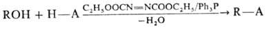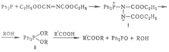 Кислотные компоненты - карбоновые к-ты, их имиды и N-гидроксиимиды, фенолы, оксимы, моно- и диэфиры фосфорной к-ты, соед. с активир. метиленовой группой. Р-цию обычно проводят при т-ре <= 20 °С, добавляя ДЭАД к смеси спирта, кислотного компонента и Ph3P в безводном апротонном р-рителе (эфир, ТГФ, гексаметапол).