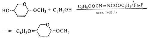 В р-ции спиртов с карбоновыми к-тaми образуются сложные эфиры с выходами 35-90%; в случае диолов осн. продукт-моноэфиры, причем этерификация проходит пре-им. по первичной группе ОН; выходы простых эфиров фенолов достигают 90-95%; циклич. имиды образуют с выходами 60-90% продукты N-алкилирования, напр.: