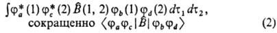 (т. наз. д в у х э л е к т р о н н ы е и н т е г р а л ы). В этих выражениях ja(1), jb(1), jс(2) и jd (2) - атомные или мол. орбитали, зависящие от переменных первого (1) или второго (2) электрона, dt1 и dt2-элементы объема для этих электронов,