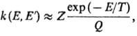 (Е — D) - число состояний активир. комплекса с энергией в интервале значений от нуля до (Е — D), причем учитываются все состояния, кроме относящихся к координате р-ции, W (E)-плотность колебат. и вращат. состояний, т.е. число состояний молекулы, приходящихся на единичный интервал энергии вблизи Е. Ф-ция k(E, E')определяется механизмом передачи энергии при столкновениях. Если вероятность дезактивации при одном столкновении близка к единице (т. наз. с и л ь н ы е с т о л к н ов е н и я), эта ф-ция имеет вид: