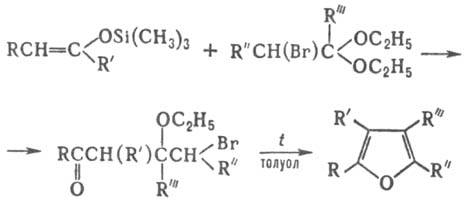 Мукайямы реакция находит применение в орг. синтезе для получения ненасыщ. альдегидов, замещенных фурана и др., напр.:
