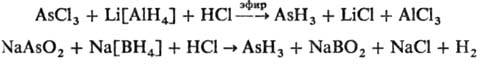 Получают AsH3 кислым гидролизом арсенидов Mg, Zn и др., восстановлением соед. As водородом, взаимод. галогенидов As или др. соед. As с Li[AlH4], Na[BH4] или др. гидридами, напр.: