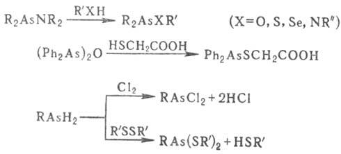 В соед. трехкоординац. As связь As—X (X = Hal, OR, OAsR2, NR2) легко расщепляется при действии нуклео-филов, связь As—Н-в электроф. и радикальных р-циях, напр.: