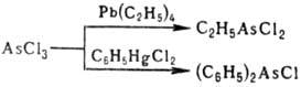 Органоарсины получают алкилированием соответствующих органоарсенидов или электроф. присоединением гидридов As к непредельным соед., подобное присоединение галогенидов As приводит к галогенорганоарсинам (см., напр., Люизит); R3As м.б. получены р-цией галогенидов As с алкил- или перфторалкилгалогенидами в присут. Na, К, Hg; ArnAsHal3-n-действием AsHal3 на арены в присут. к-т Льюиса; RnАsСl3-n-взаимод. орг. производных Zn, Pb, Sn, Hg c AsCl3, напр.: